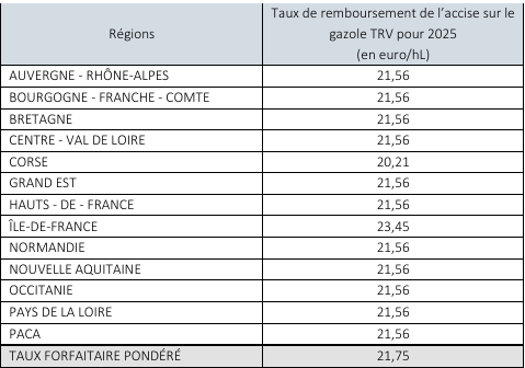 En 2026, le taux d’accise appliqué au gazole professionnel TRV s’élève à 39,19 €/hL5. Le taux de